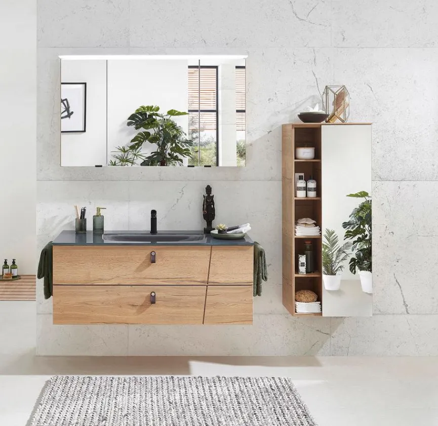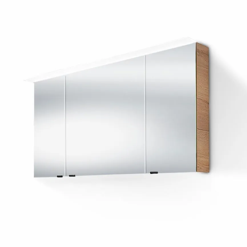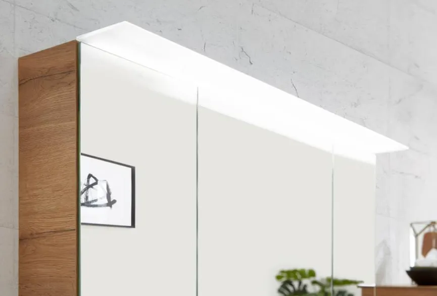 - Mit 3 Drehtüren, doppelt verspiegelt und mit 6 GlaseinlegebödenInkl. Schalter-Steckdosen-Kombination