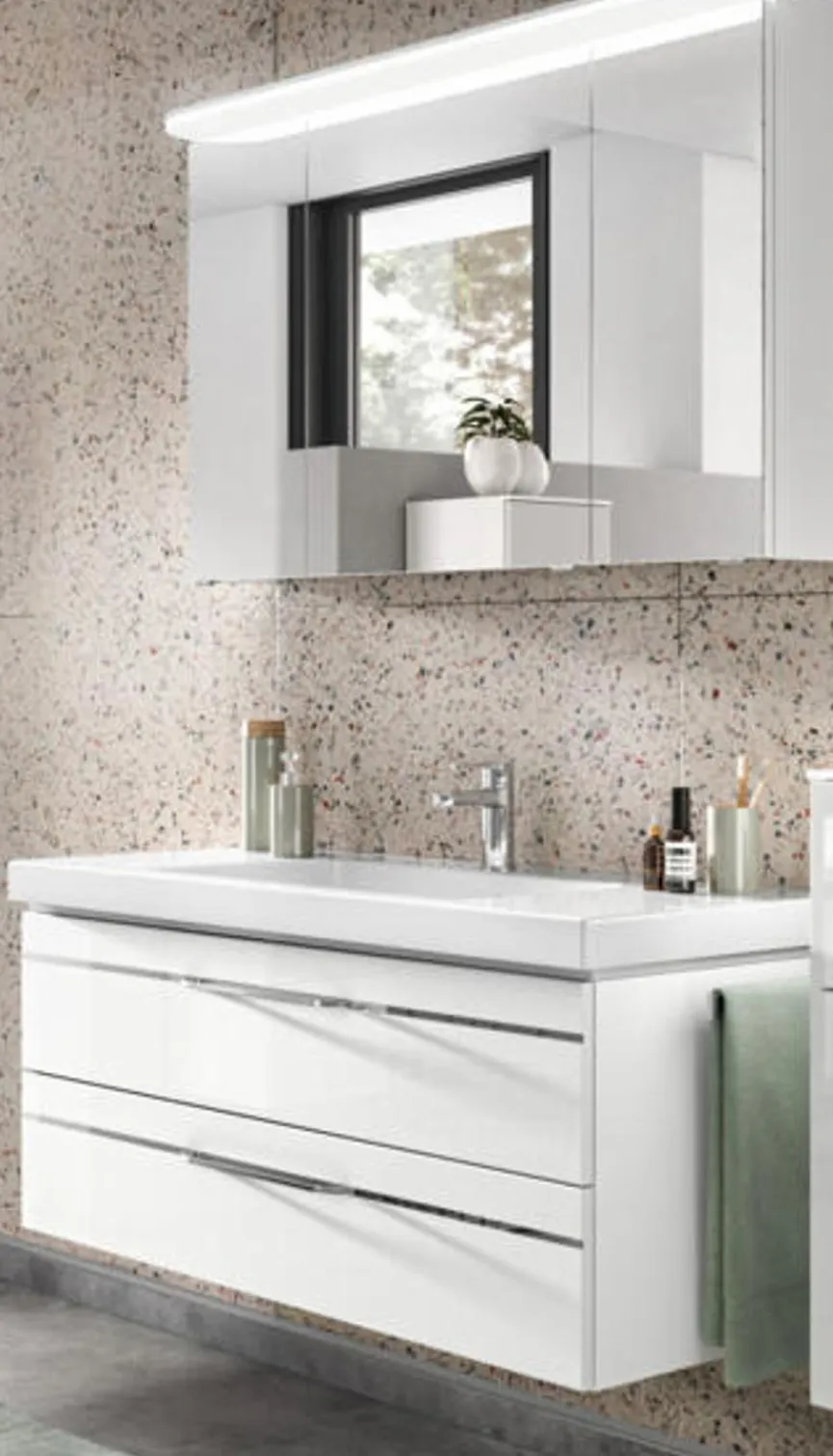 - Mit Mineralmarmor-Waschtisch in Weiß mit Armaturlochbohrung und integriertem Überlauf