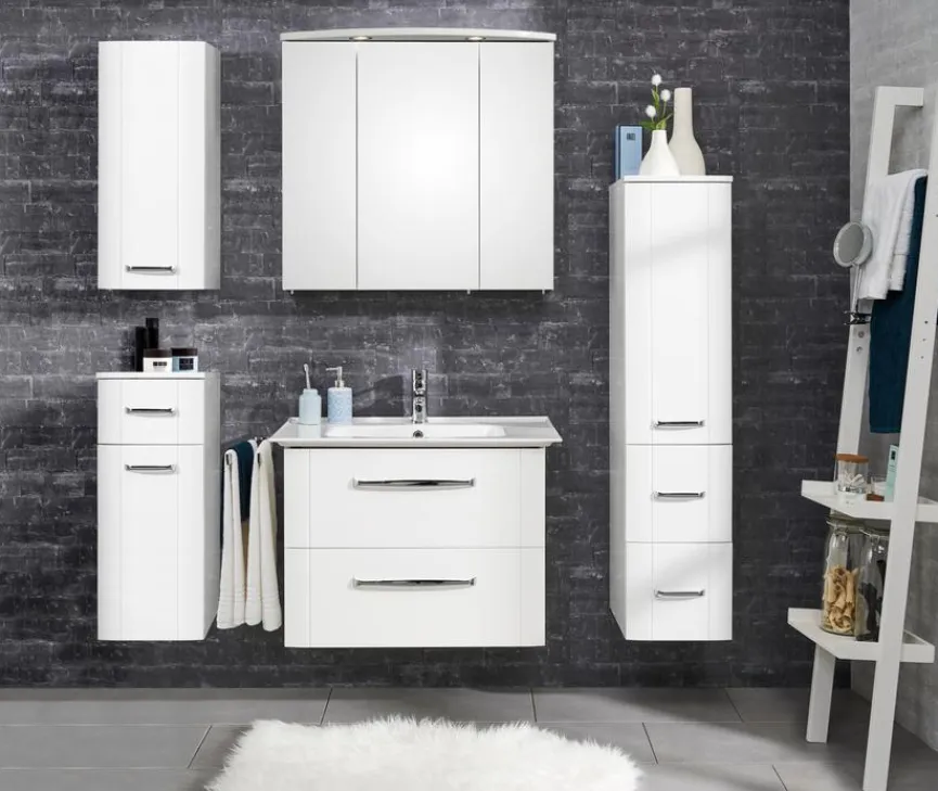 - Korpus aus Holzwerkstoff (Spanplatte) mit kratzfester Melaminharzfolie in Schneeweiß Glanz