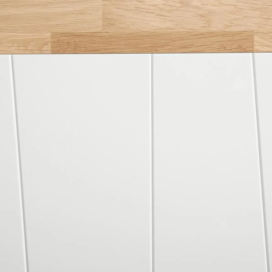 - Kopf- und Fußteil aus Holzwerkstoff (MDF) in weiß lackiert, Fußrahmen und Füße aus massiver Eiche