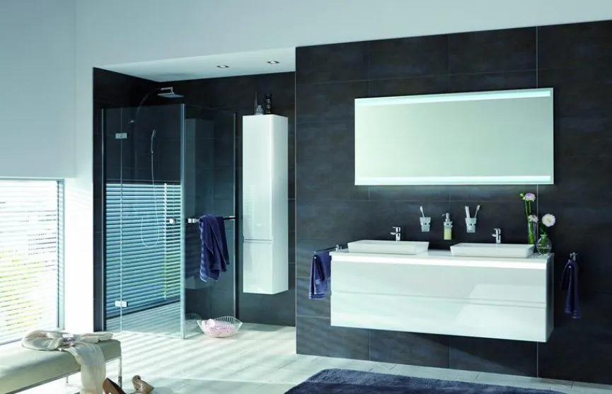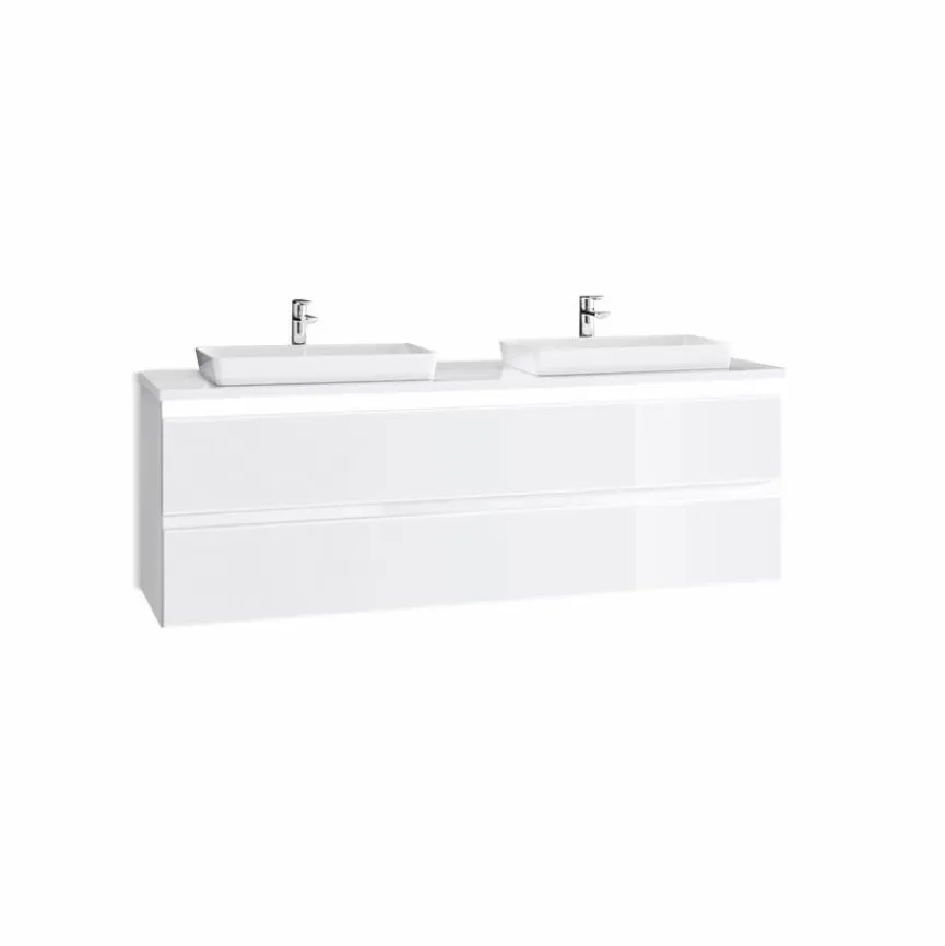 - Mit Mineralgussplatte mit 2 Aufsatzwaschtischen je 49 cm breit in Weiß inklusive Permanentablauf und LED-Beleuchtung, 6,5 Watt, Converter 15 Watt (nur mit nicht verschließbaren Ablaufventilen kombinierbar)