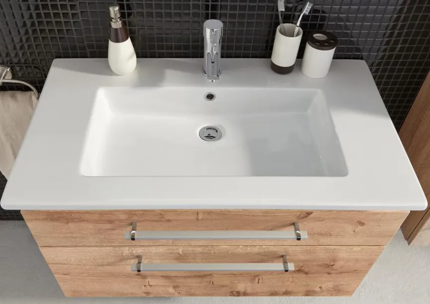- Bestehend aus Waschtischunterschrank mit 1 Metallschubkasten mit Einzugsdämpfung und Einteilungselemente aus Holz, 1 Metallauszug mit Einzugsdämpfung inklusive Reling, 1 Abdeckplatte, 1 Dekorplatte in Charleston Eiche und 1 Raumsparsiphon