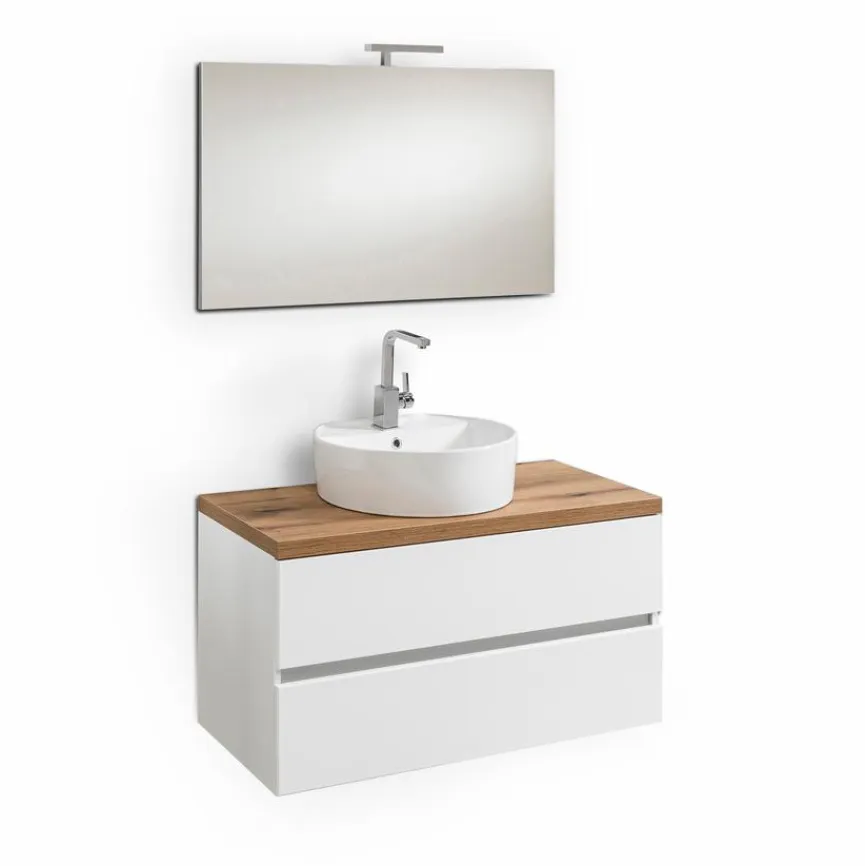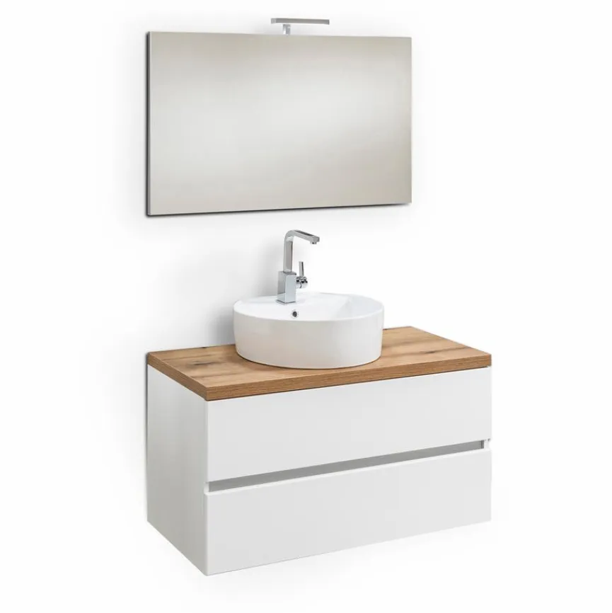 - Waschbeckenunterschrank hängend mit 2 Schubladen mit Dämpfung inkl. Ablageplatte aus Holzwerkstoff (Spanplatte) in Eiche Natur