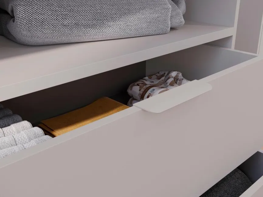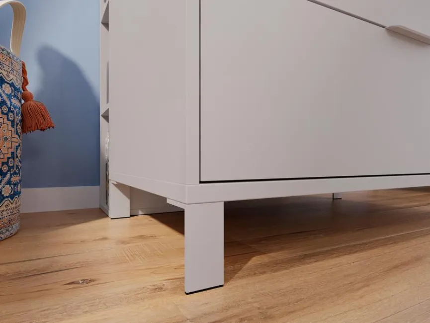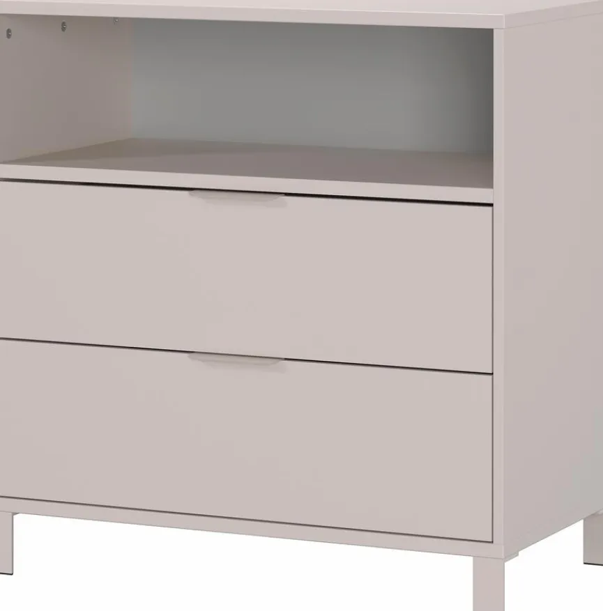 - Aus Holzwerkstoff (Spanplatte) mit kratzfester Melaminharzfolie in Kaschmir, Griffe aus Metall in Kaschmir