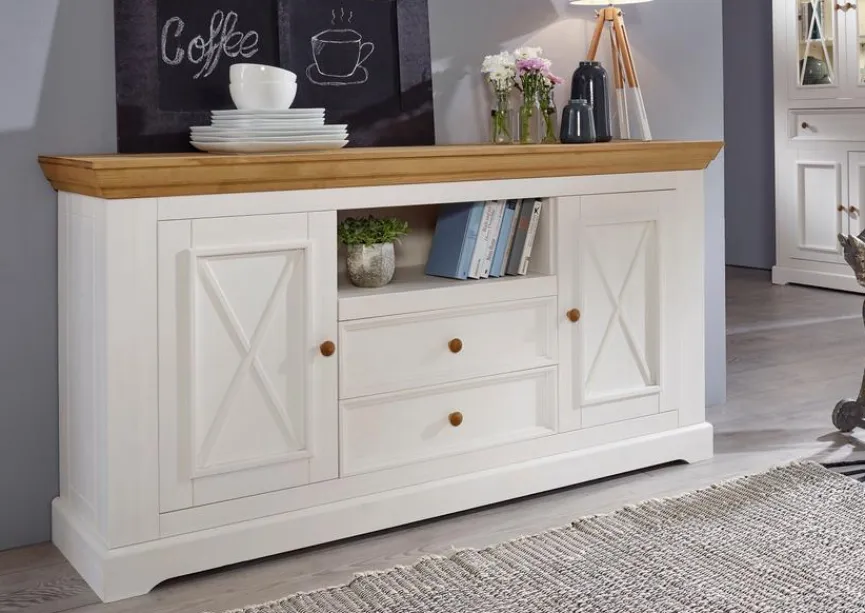 Das Sideboard Minnesota präsentiert sich in einem schicken Design im Landhaus-Stil. Die Optik der Kommode wird durch die geschmackvolle Formgebung und die farblich abgesetzte Abdeckplatte bestimmt. Darüber hinaus bietet das Sideboard in vielen verschiedenen Fächern ausreichend Stauraum für die Aufbewahrung diverser Gegenstände.