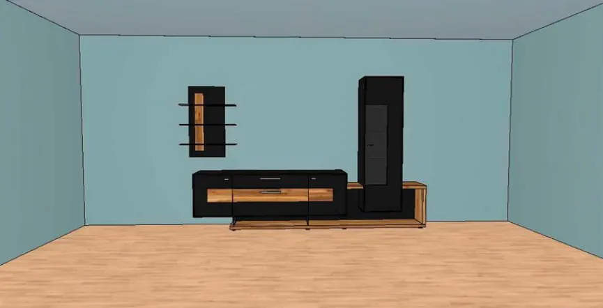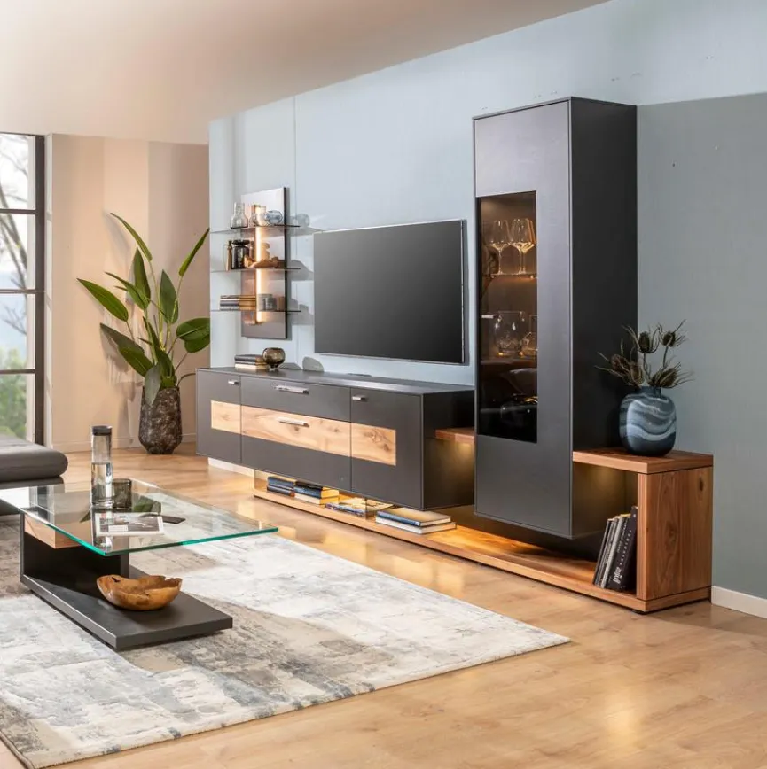 - Wohnwand besteht aus Unterbau, Vitrine, Lowboard und Wandboard