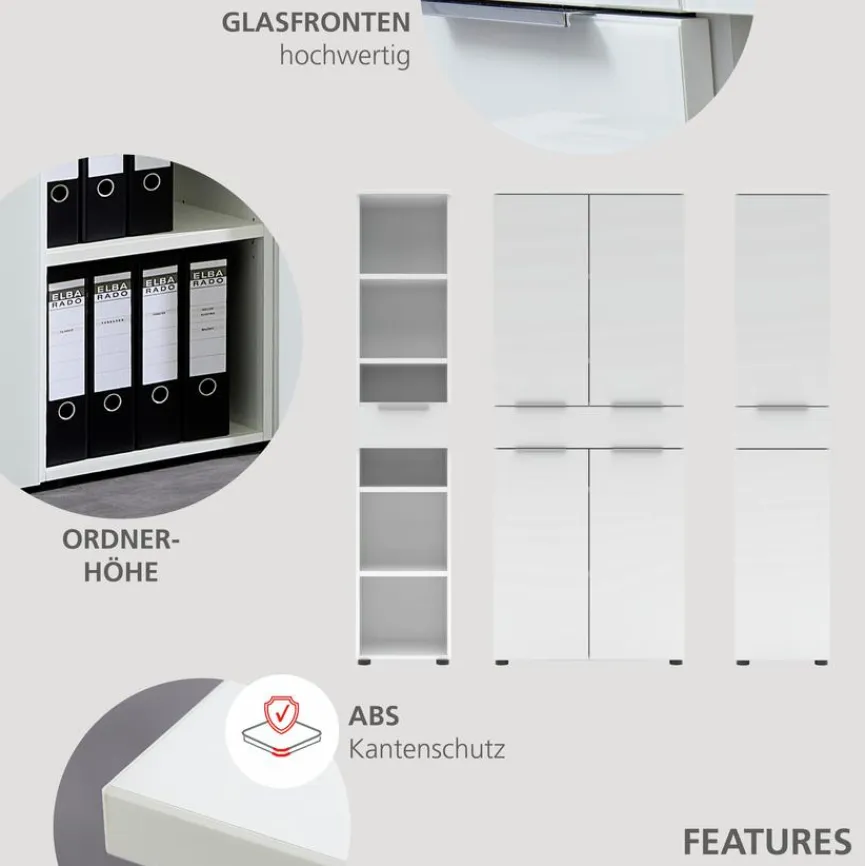 - Korpus aus Holzwerkstoff (Spanplatte) mit kratzfester Melaminhrazfolie in weiß, Front in weiß Glas