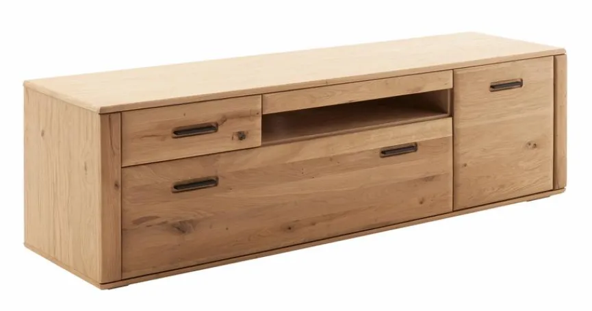 - Korpus aus Holzwerkstoff (Spanplatte) Ast/Balkeneiche furniert in Kristalleiche geölt, Front aus Ast/Balkeneiche massiv durchgehende Lamelle in Kristalleiche geölt