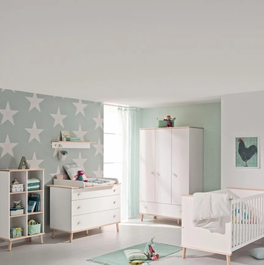 - Set besteht aus Babybett 70 x 140 cm, Schrank BHT 125 x 198 x 56 cm, Wickelkommode BHT 125 x 90 x 56 cm und Wickelaufsatz BHT 125 x 12 x 79 cm