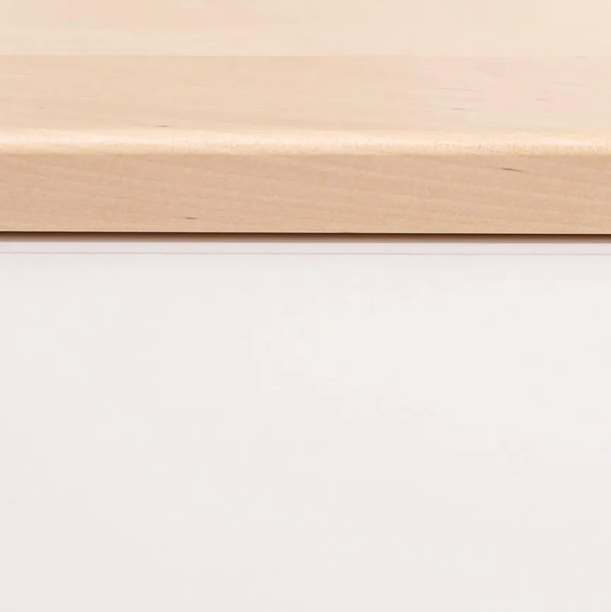 - Aus Spanplatte mit kratzfester Melaminharzfolie in Kreideweiß, Füße, Deckplatte und Absetzungen aus massiver Birke