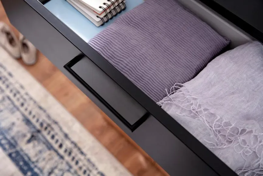 - Korpus, Schubladenfront und Garderobenpaneel aus Holzwerkstoff (Spanplatte) mit Lack anthrazit