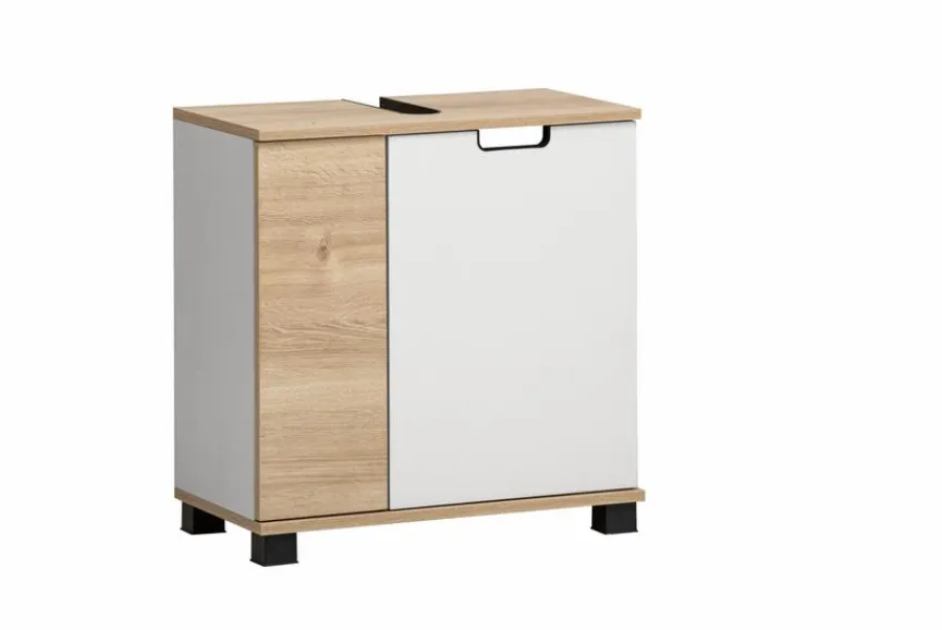 - Front und Korpus aus Holzwerkstoff (Spanplatte) mit kratzfester Melaminharzfolie in Weiß und Akzente in Eiche hell