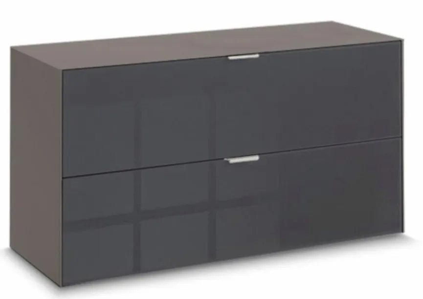 - Aus Holzwerkstoff (Spanplatte), Korpus mit kratzfester Melaminharzfolie in anthrazit matt, Front und Oberplatte aus Glas glänzend anthrazit lackiert