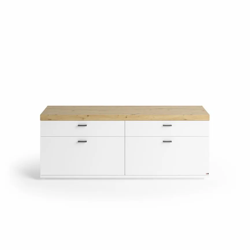 Klare Symmetrien und ein mattes Finish machen das set one by Musterring TV-Lowboard Lancaster zu einer Einrichtungsidee, die für moderne Eleganz steht. Eine Absetzung in Holzoptik verleiht dem TV-Unterschrank außerdem eine schöne Wellbeing-Note. Das TV-Lowboard Lancaster stellt eine prädestinierte Ergänzung zu einem Highboard und einem Couchtisch aus dieser Möbelserie dar.