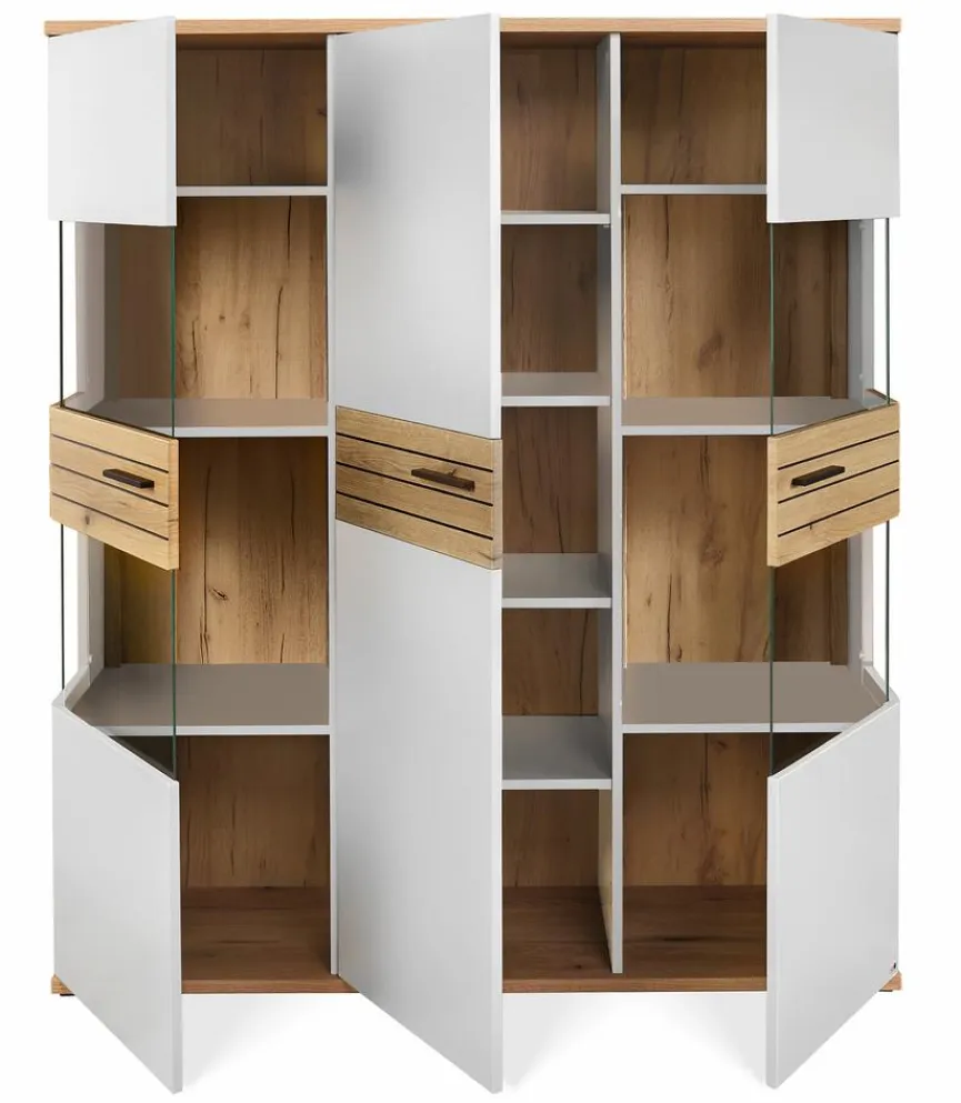 - Mit 3 Türen – 2 Türen davon mit je 2 Glasausschnitten, 4 Einlegeböden