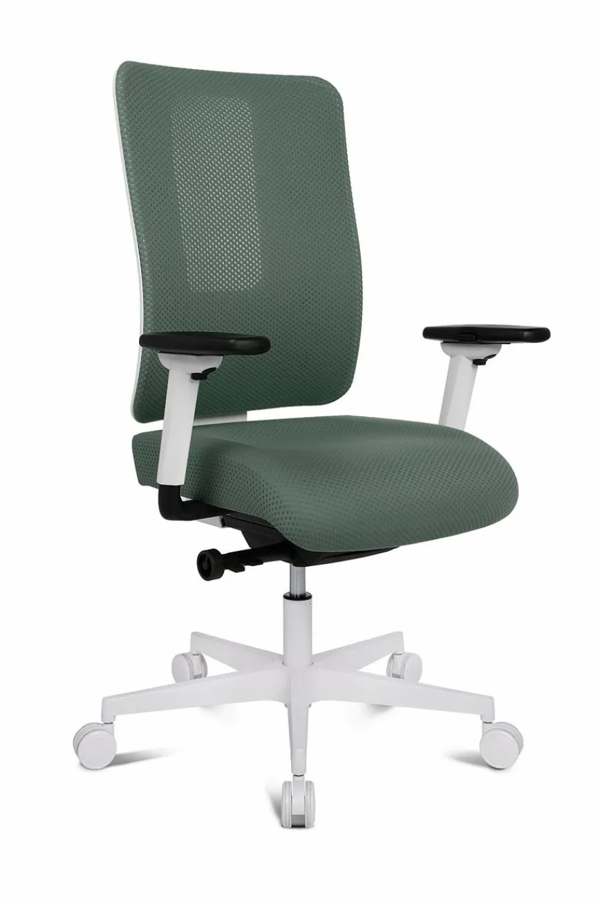 - Atmungsaktiver Netzbezug aus Stoff in Graugrün, Gestell aus Kunststoff in weiß