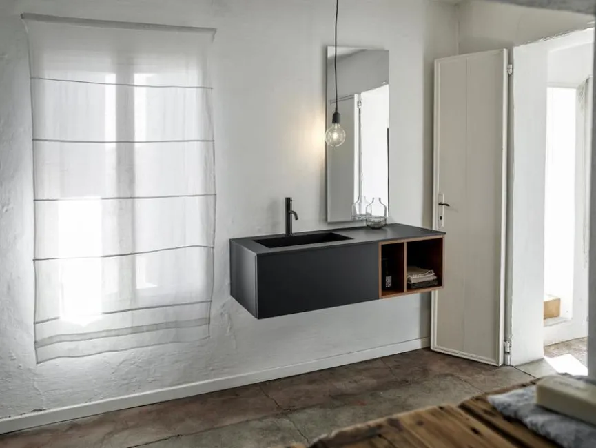 - Waschtischplatte mit Becken Frame Fenix, ohne Überlauf, mit Permanentablauf, inkl. Hahnloch, verchromte Ablaufgarnitur und Ablaufdeckel mit freiem Ablauf-Becken links (nur mit nicht verschließbaren Ablaufventilen kombinierbar)