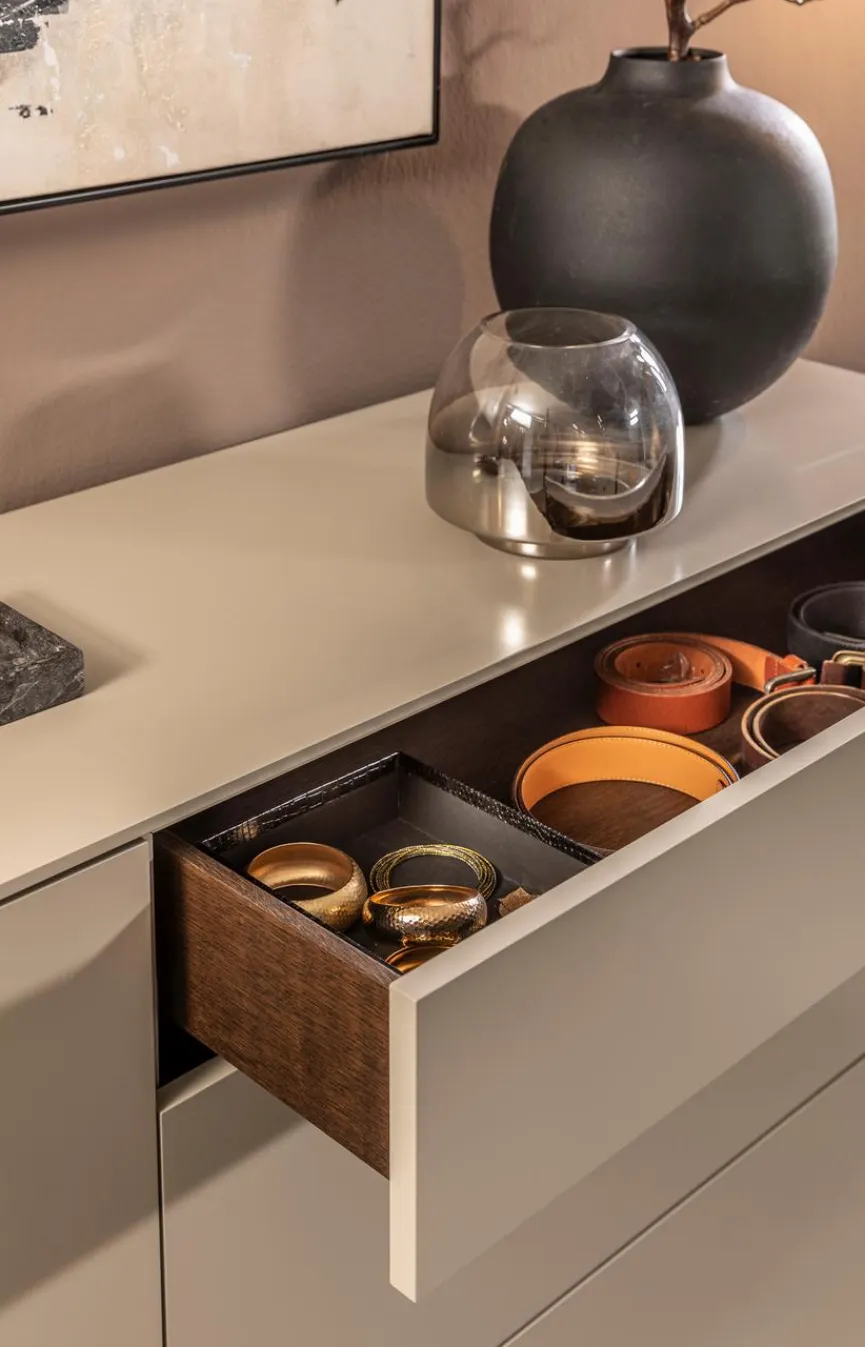 Auf der Kommode Marsala von Sormani lassen sich Dekogegenstände, Bücher oder etwa Blumenvasen stilsicher in Szene setzen. In vier geräumigen Fächern finden zudem zahlreiche Gegenstände gut sortiert ihren Platz. Doch auch optisch ist die Kommode Marsala mit ihrem cleanen, klar strukturierten Design eine attraktive Bereicherung für Ihr Zuhause.
