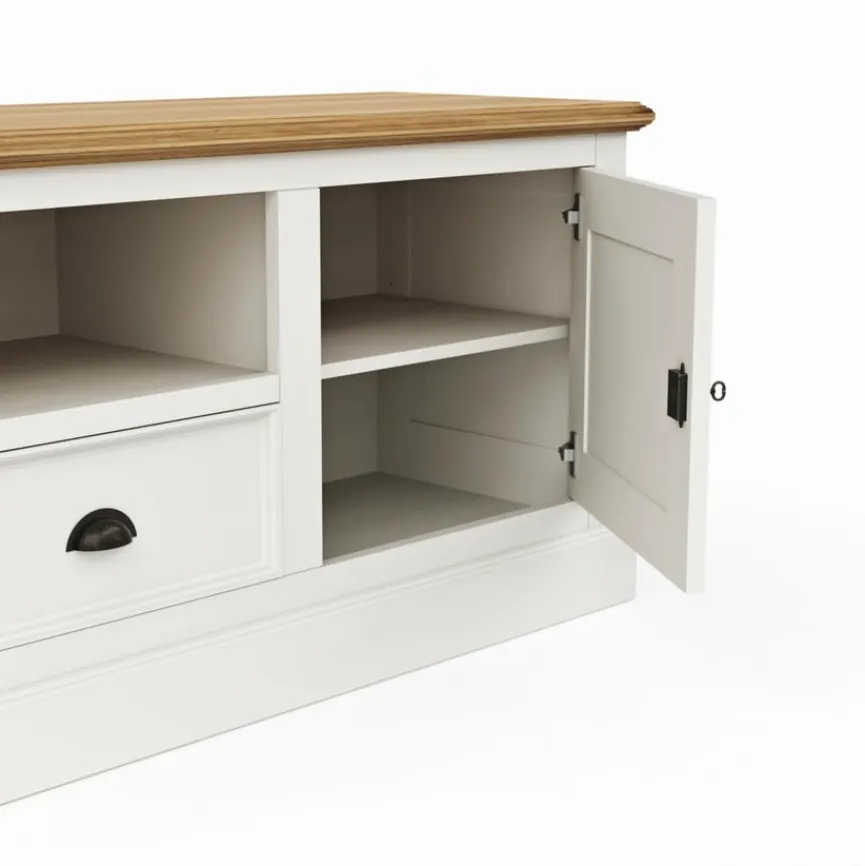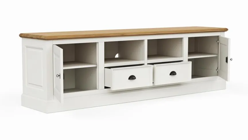 Mit dem Lowboard Barreiro schaffen Sie ein stilvolles Plätzchen für Ihr TV-Gerät. Charmante Profilierungen und herrlich dekorative Muschelgriffe sind die prägenden Designelemente dieses geräumig gestalteten Sideboards. In ein Gemütlichkeit ausstrahlendes Wohnzimmer mit Akzenten im freundlichen Landhaus-Look lässt sich das Lowboard Barreiro gekonnt und geschmackvoll integrieren.