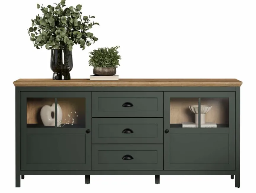 - Mit 2 Türen mit Glaseinsatz, 2 Einlegeböden und 3 Schubkästen