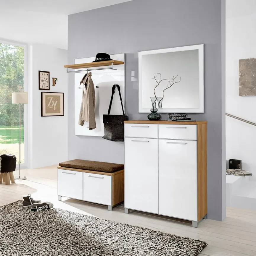 - Garderobe aus Garderobenbank, Sitzkissen, Garderobenpaneel, Schuhschrank und Spiegel