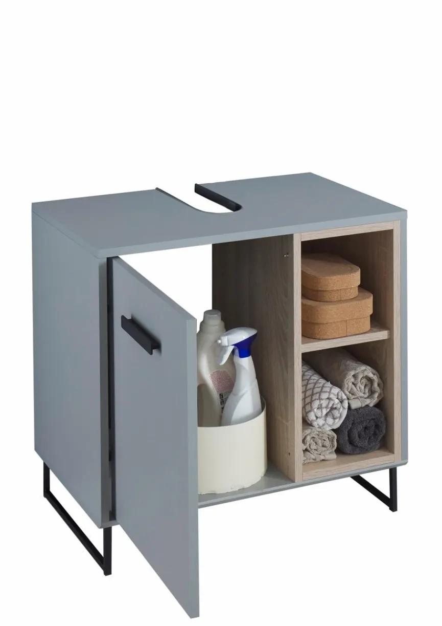 Für zeitgemäße Eleganz in Ihrem Bad sorgt der Waschbeckenunterschrank Tunis. Neben der ansprechenden Optik punktet der kleine Schrank auch als praktischer Ordnungshelfer. Im Inneren finden Handtücher oder Drogerie-Artikel Platz, die beiden offenen Fächer bieten Stauraum für Dinge, die man im Bad gern schnell zur Hand hat. Natürlich finden hier alternativ auch Pflegeutensilien einen Aufbewahrungsort. Der Waschbeckenunterschrank Tunis verfügt selbstverständlich über einen Syphon-Ausschnitt.