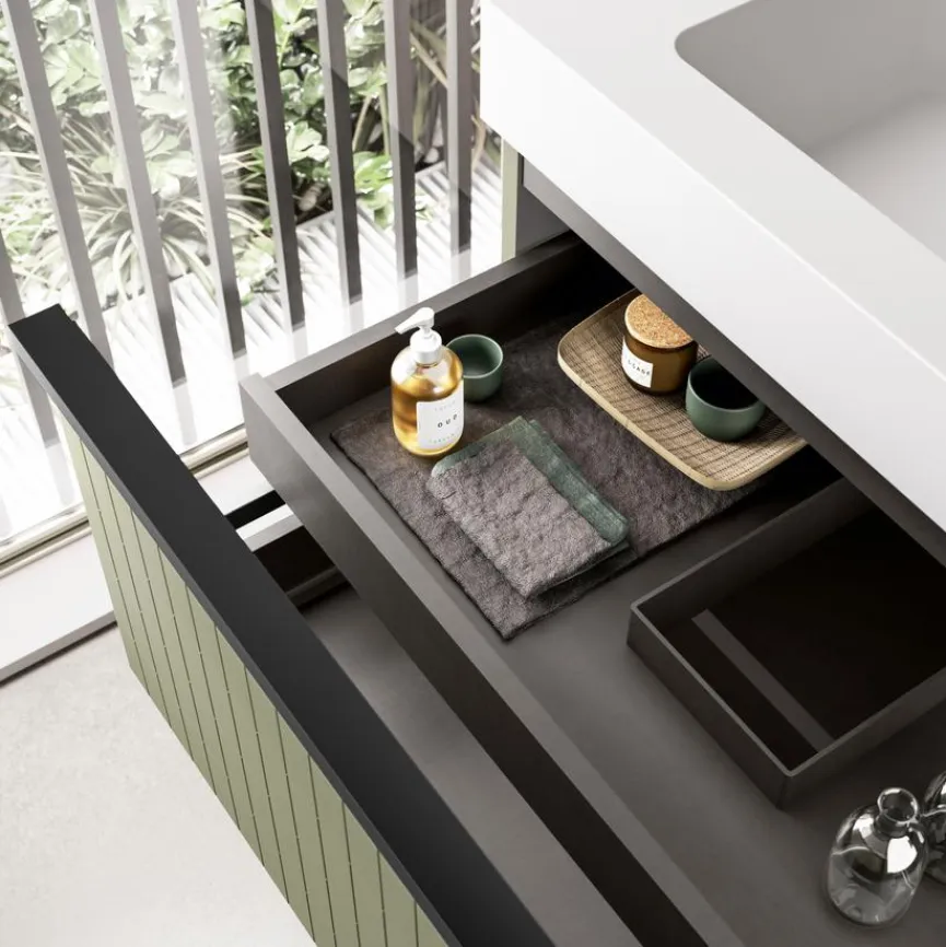 - Waschtischunterschrank mit 1 Auszug (inkl. 1 Innenauszug) mit der Fronttype Grid in salbeigrün matt lackiert
