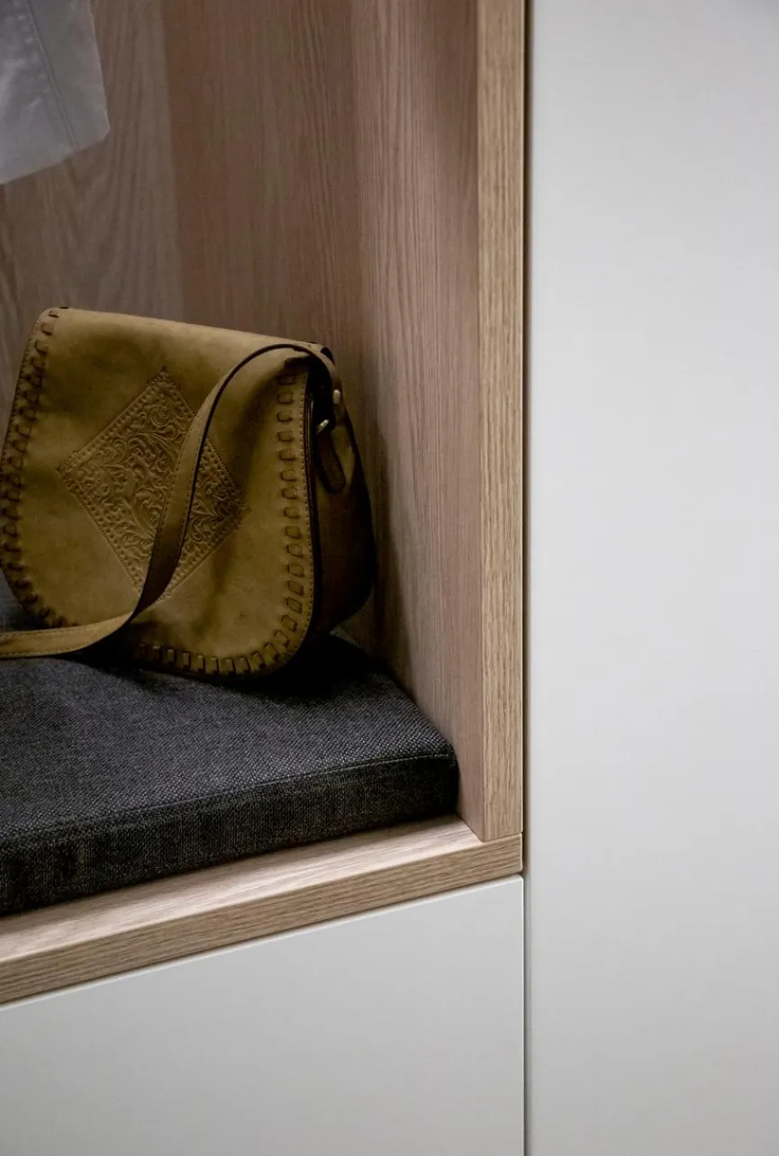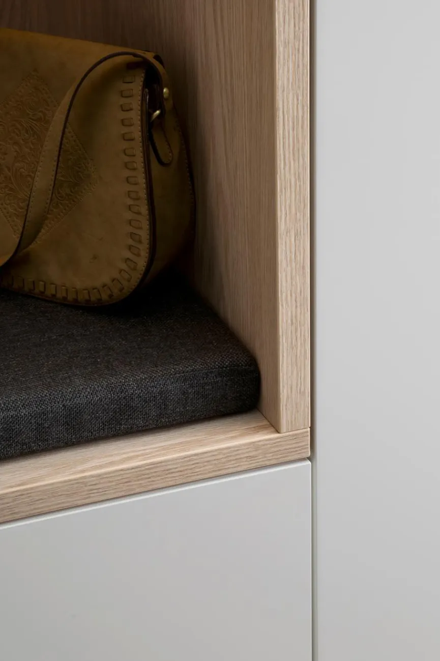 - Bestehend aus: 3 Hochschränke, 5 Fachböden, 2 Innenschubladen, 1 Unterstellschrank, 1 Garderobe, 1 Sitzkissen, 1 Aufsatz und 1 Kleiderstange