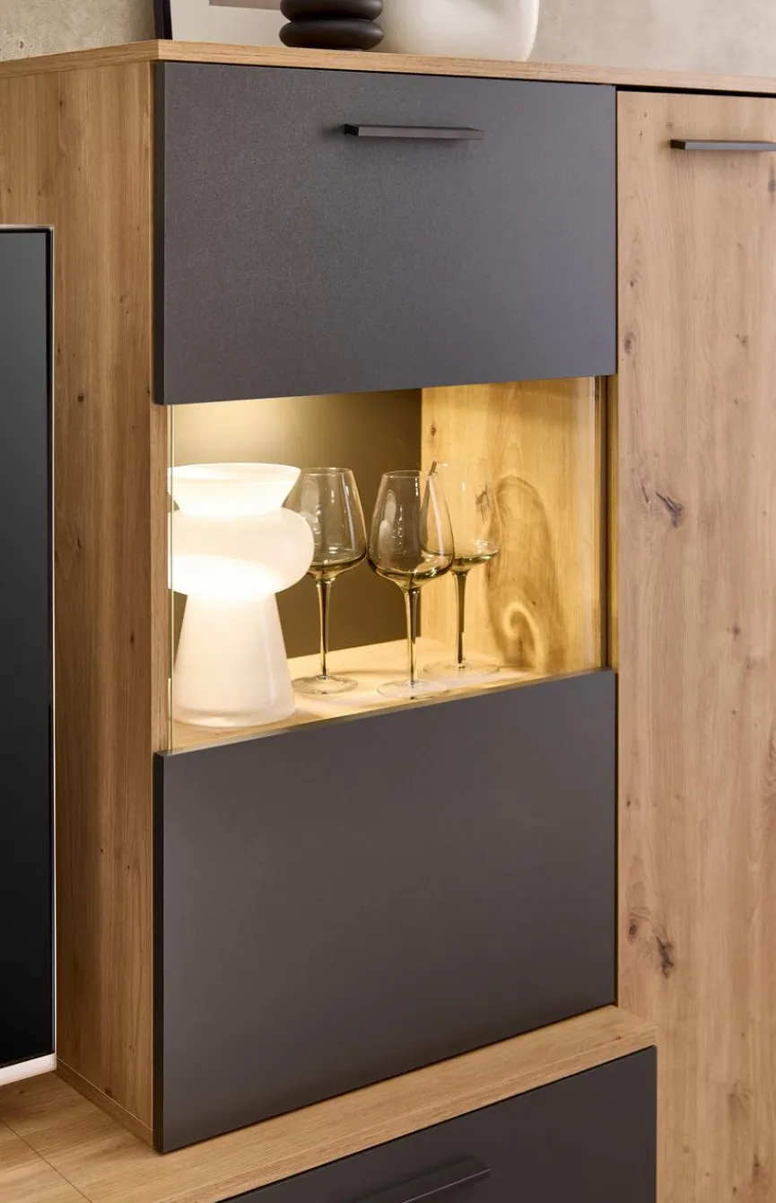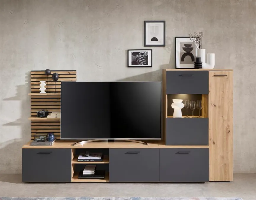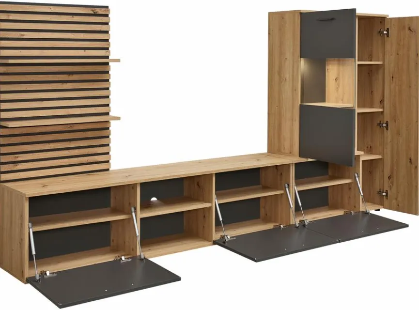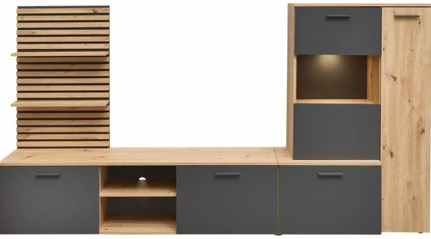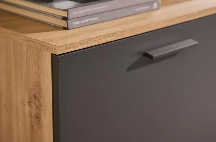 - Aus Holzwerkstoff (Spanplatte) mit kratzfester Melaminharzfolie in Artisan Eiche, Absetzung aus Holzwerkstoff (Spanplatte) mit kratzfester Melaminharzfolie in Anthrazit, Lamellen beim Wandboard aus Holzwerkstoff (MDF) in Artisan Eiche foliert