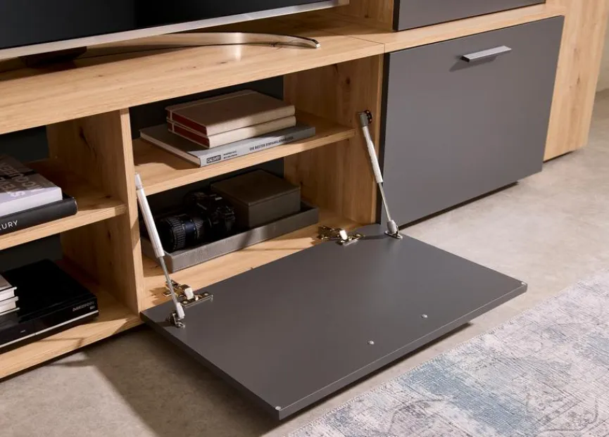 - TV-Lowboard links mit 2 Klappen, 2 offenen Fächern, 2 Einlegeböden und 1 Konstruktionsboden