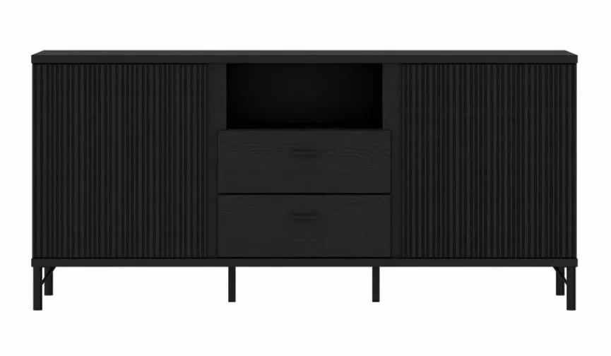 - Korpus aus Holzwerkstoff (Spanplatte) mit kratzfester Melaminharzfolie in Schwarz graphit, Front und Rillen aus Holzwerkstoff (MDF) mit hochwertiger Dekorfolie in Schwarz