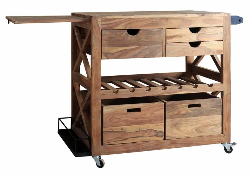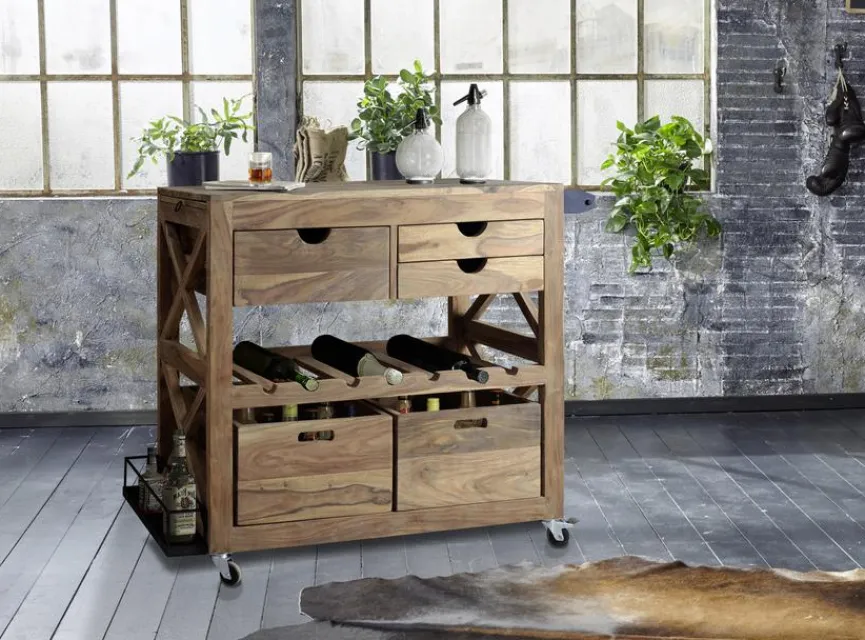 Der Servierwagen Yoga von WOLFMÖBEL bietet dank seiner drei Schubladen, sieben Flaschenhalter und zwei Boxen besonders viel Platz. Mit diesem praktischen Helfer lassen sich Speisen, Besteck sowie Getränke zügig und sicher transportieren. Jeder Mahlzeit verleiht der Servierwagen Yoga der Marke WOLFMÖBEL eine stilvolle Note.